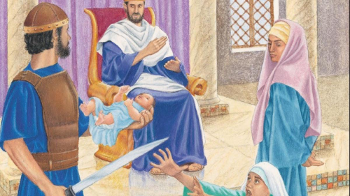 I Det gamle testamente bliver Kong Salomon opsøgt af to kvinder med et spædbarn, som de begge hævder er deres. Den ene af kvinderne har mistet sit barn, og insisterer derfor på, at hun er er mor til den anden kvindes barn. Solomon skal afgøre hvem, der i virkeligheden er mor til barnet. Så han sender bud efter et sværd og siger: