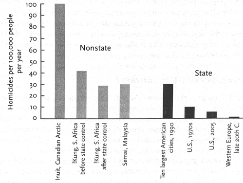 Udbredelsen af stater bragte derfor menneskeheden et stort skridt tættere på en fredeligere verden. Da mennesker begyndte at leve i byer, faldt andelen af voldelige dødsfald derfor til cirka en femtedel, sammenlignet med før. [xvi]