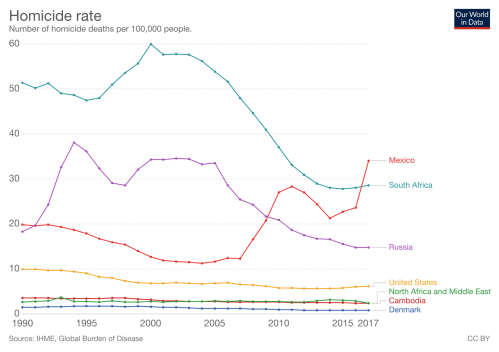 - Mexico og Sydafrika har ganske rigtigt en høj mordrate*. Især hvis vi ser på, hvordan det var i Sydafrika for et par årtier siden.