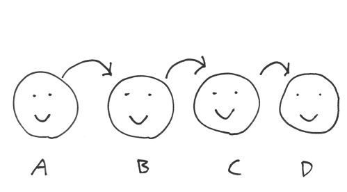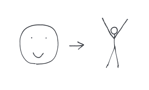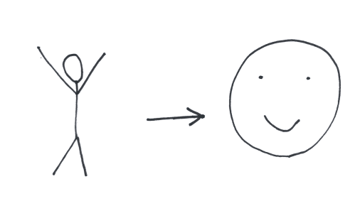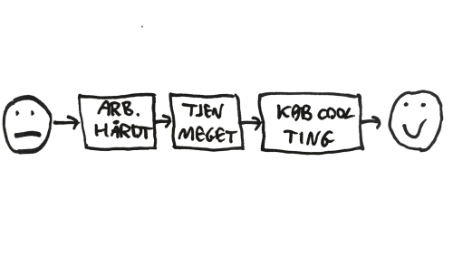 Hvis man spørger danskere “Bliver man lykkelig af at have mange penge?”, vil de fleste nok sige nej. Det er en kliche, at penge ikke nødvendigvis fører til lykke, men alligevel er ovenstående model en del af vores virkelighed. Virksomheder som er dygtige til marketing, fortæller en historie om, at virksomhedens produkt vil gøre os glade (som regel gennem nydelse eller boost af vores ego). Den underliggende besked er: Hvis du køber vores produkt, bliver du lige så glad/smuk/populær som dem i reklamerne.
