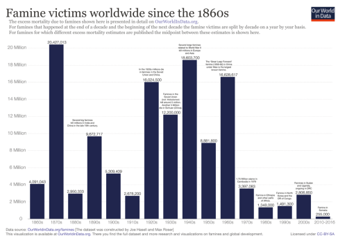 Grafen herunder viser, hvor mange menneskeliv hungersnød løbende har kostet siden slutningen af 1800-tallet: