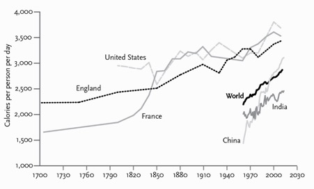 Der er flere kalorier tilgængelige (pr. person) i nutidens fattige lande, end der var i fortidens rige lande[ix].