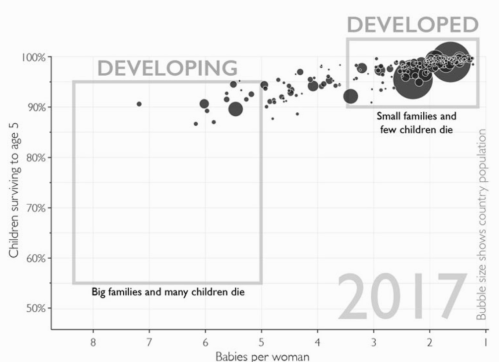I land efter land viser det sig, at når flere børn overlever, får folk færre børn. Typisk får befolkningen i udviklede lande få børn (næsten alle overlever), mens befolkningen i udviklingslande får mange børn (hvoraf mange dør):