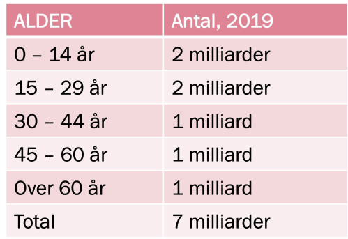 For at finde svaret, skal vi se på hvor mange mennesker der findes i verden inden for forskellige aldersgrupper: