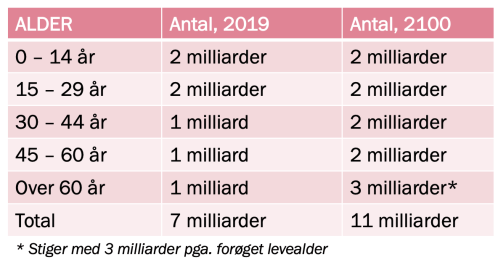 De 0 – 30-årige, der findes i dag, forventes at blive over 60 år. Befolkningstilvæksten de næste 80 år sker altså ikke fordi, der kommer flere børn, men fordi der kommer flere voksne.