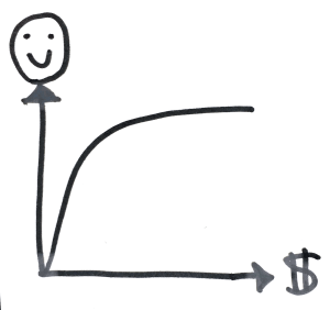 Psykologen Ed Diener har indsamlet store mængder data, som viser en sammenhæng mellem indkomst og glæde. Jo flere penge du tjener, jo gladere er du. Undersøgelsen viser dog at penge gør en mindre forskel jo mere du tjener. Hvis du tjener så lidt at du ikke har råd til husleje og mad vil flere penge gøre dig lykkeligere. Men hvis du har hvad du har brug for, vil penge kun gøre en lille forskel. Forestil dig at du har en tom rygsæk på ryggen. Hvis jeg lægger en flaske vin ned i rygsækken vil du straks mærke at den er blevet tungere. Forestil dig nu at du skal til Spanien og har pakket en stor kuffert. Hvis jeg lægger vinen herned vil du måske kunne mærke at kufferten er blevet en anelse tungere, men forskellen vil føles mindre. Her er et andet eksempel. Alle kan blive enige om at det føles godt at vinde 100 DKK og bedre at vinde 200 DKK. Men det føles ikke dobbelt så godt at vinde 200 DKK som at vinde 100 DKK, selvom gevinsten er dobbelt så høj.