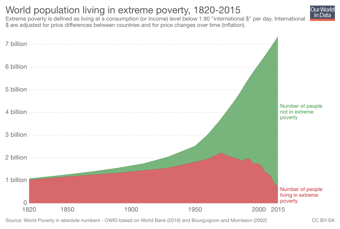 Verden bliver mindre voldelig, færre børn dør før de fylder fem år, flere har adgang til uddannelse, flere lever i demokrati og flere mennesker oplever højere livskvalitet end nogensinde før i verdenshistorien. Og færre end nogensinde før lever i ekstrem fattigdom. Nedenstående graf viser udviklingen gennem de sidste 200 år: