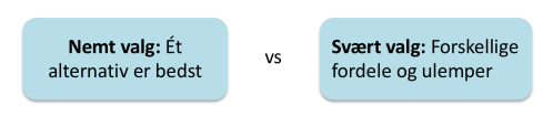Et svært valg er karakteriseret ved, at der ikke er et alternativ, som på alle måder er bedst. Mulighederne har forskellige fordele og ulemper.