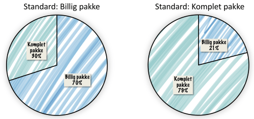 I et eksperiment (5) blev amerikanske bilister præsenteret for to forskellige forsikringer: Den billige pakke og den komplette pakke (som ville være bedre i tilfælde af uheld). Omtrent halvdelen af bilisterne fik den billige pakke præsenteret som “standardpakken” (som træder i kraft, medmindre man aktivt vælger noget andet), mens de andre fik den komplette pakke præsenteret som standardløsningen. Cirkeldiagrammerne herunder viser de to gruppers valg: