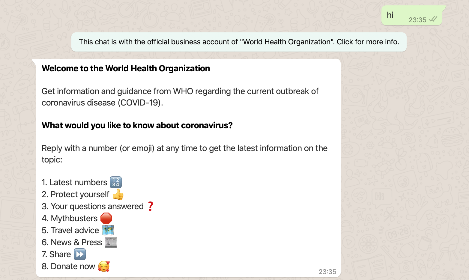 Bonus: Få information fra WHO gennem Whatsapp (klik her for info). Du skriver “hi” til nummeret +41 22 501 76 55, og så får du følgende besked: