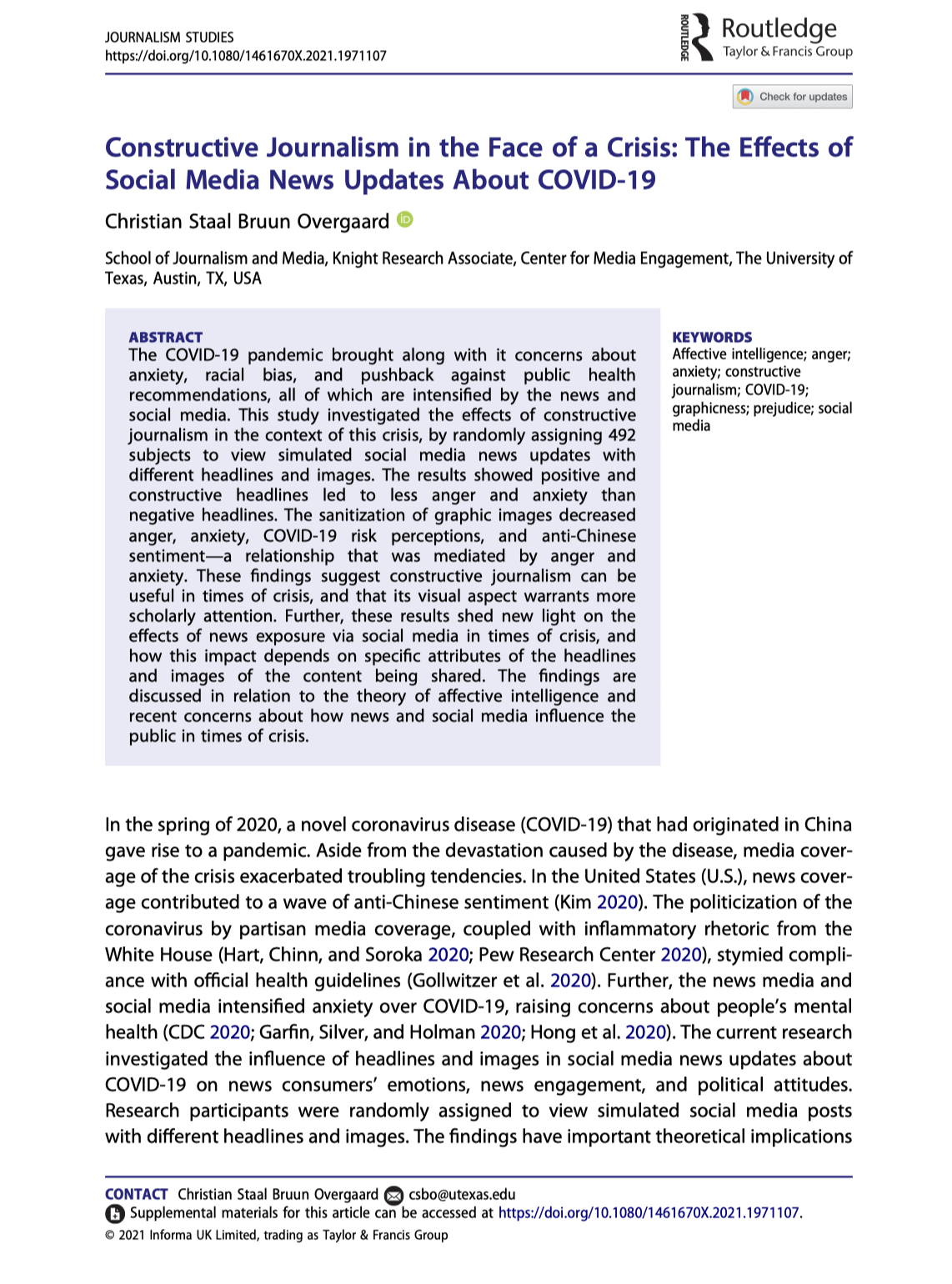 Suggested citation: Overgaard, C. S. B. (2021). Constructive Journalism in the Face of a Crisis: The Effects of Social Media News Updates About COVID-19. Journalism Studies, 1–19. https://doi.org/10.1080/1461670X.2021.1971107